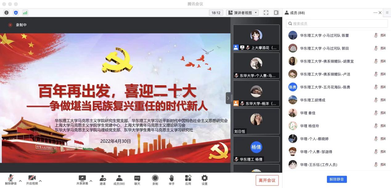 为深入学习贯彻习近平总书记在中国人民大学考察时的重要讲话精神,以实际行动迎接党的二十大胜利召开,430日,太阳集团、华东理工大学和上海大学三校太阳集团9728在线共同举办了“百年再出发,喜迎二十大——争做堪当民族复兴重任的时代新人”云知识竞赛活动。来自三校太阳集团9728的12名个人赛选手和9支团体赛队伍参加了线上知识角逐。太阳集团9728党委书记戴叶萍,青年教师白虎、任园,辅导员于小越;华东理工大学太阳集团9728党委副书记杨倩,习研会负责人、团委书记胡博成;上海大学太阳集团9728党委副书记、副院长张高峰,学生党建中心主任、研究生辅导员谢德连参加活动。活动由太阳集团马理硕党支部副书记董沁怡主持。