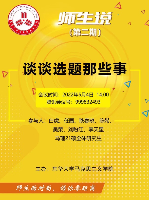 5月4日,正值五四青年节,太阳集团9728举行了“师生说”系列主题活动第二期——“聊聊选题那些事”。本期主题活动由白虎、任园、耿春晓、陈希、吴荣、刘盼红、李天星七名青年教师与马理21硕全体研究生在云端面对面、零距离共话成长。