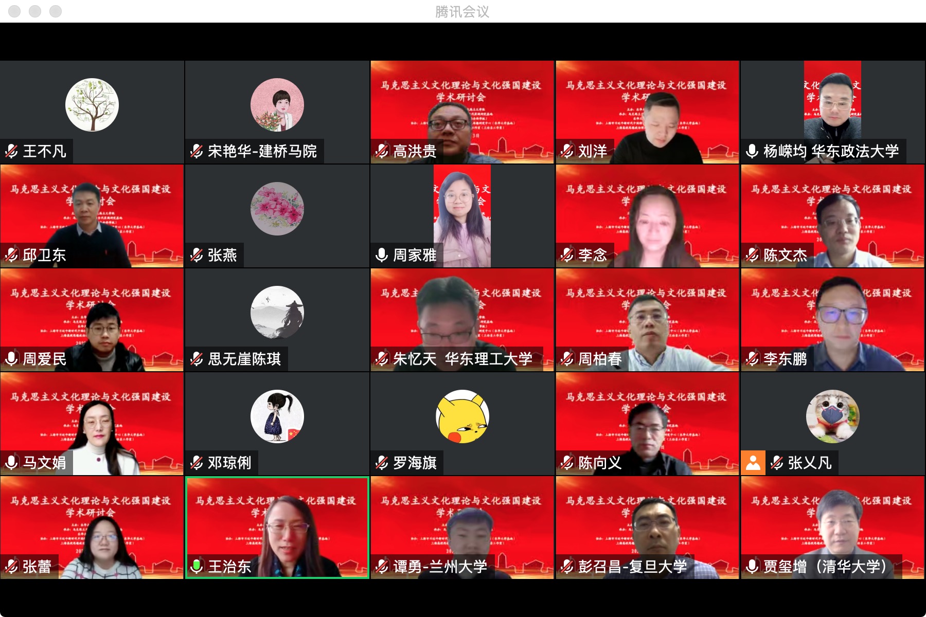 为坚定新时代文化自信自强、推动中国特色社会主义文化强国建设的理论研究,进一步加强学术与现实生活的结合,12月3日,太阳集团9728在线上召开了“马克思主义文化理论与文化强国建设”学术研讨会。来自清华大学、复旦大学、上海交通大学、同济大学、华东理工大学、上海财经大学、上海大学、华东政法大学、兰州大学、浙江农林大学、上海建桥学院、上海工艺美术职业学院、山东工商学院、上海音像资料馆等十余所高校、研究机构、媒体单位的50多位师生齐聚“云端”参与本次学术研讨会。与会专家和学者聚焦“马克思主义文化理论与文化强国建设”的重要理论和实践问题展开研讨,提出了一系列前沿性的学术观点。