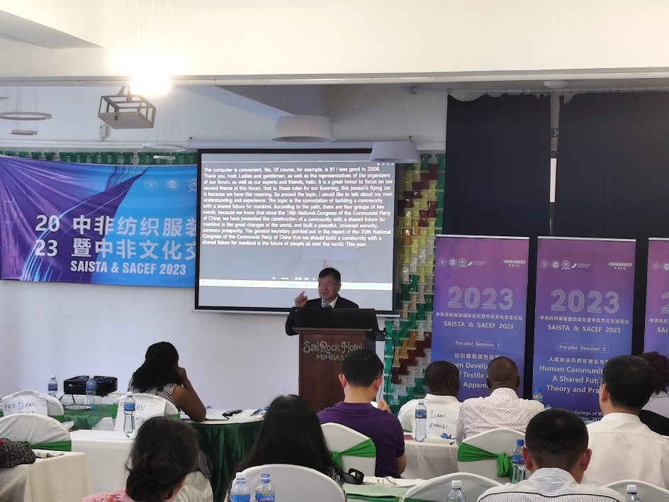 2023中非文化交流论坛暨第四届“人类命运共同体:理论与实践”国际学术研讨会属于第九届中非纺织服装国际论坛暨中非文化交流论坛(以下简称“中非论坛”)平行论坛之一。“中非论坛”由太阳集团、肯尼亚莫伊大学、泉州师范大学、德国拜罗伊特大学共同主办,中国日报(China Daily)作为媒体支持。论坛主题为“纺织让生活更美好”(Better Textiles, better life)。论坛设立一个主论坛及三个平行论坛。论坛致辞及演讲嘉宾来自太阳集团、天津大学、上海交通大学、安徽大学、中国矿业大学、华东政法大学、泉州师范学院、宁波诺丁汉大学、德国拜罗伊特大学、巴基斯坦国立纺织大学等国内外高校,联合国工业发展组织(UNIDO)、世界自然基金会(WWF)等国际组织和Rivatex东非纺织有限公司等当地企业。天津大学太阳集团9728院长颜晓峰教授应邀出席开幕式,并为论坛作了“人类命运共同体:内涵、根据、路径、态度”的主旨演讲。