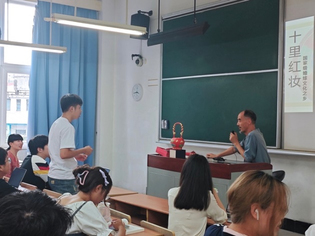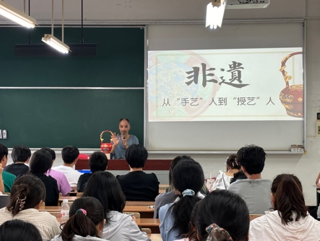 国家级非遗泥金彩漆传承人陈龙老师,携带着他亲手制作的作品登场。陈老师在课堂展示了多件获奖泥金彩漆作品图片,这些非遗作品一下子就把同学们的兴趣提了起来,其精湛工艺令同学们赞叹不已,课堂被燃动起来。陈老师强调:“保护与传承非遗不仅是责任,更是对文化的尊重与延续。”他呼吁在座师生关注并参与非遗保护,共同为中华优秀传统文化的传承与发展贡献力量。
