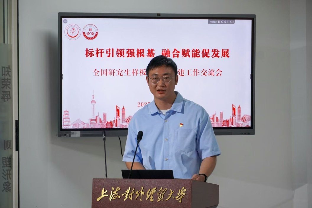 我院马理硕党支部书记王子晋详细介绍了支部党建工作的开展情况与工作经验,他以“红色文化铸品牌,党性锤炼践初心”为题分享了马理硕党支部“以党建带团建”,构建“导学-领学-自学-研学”四维学习体系、形成“原著精读+热点研讨+实践转化”模式等方面的相关探索。