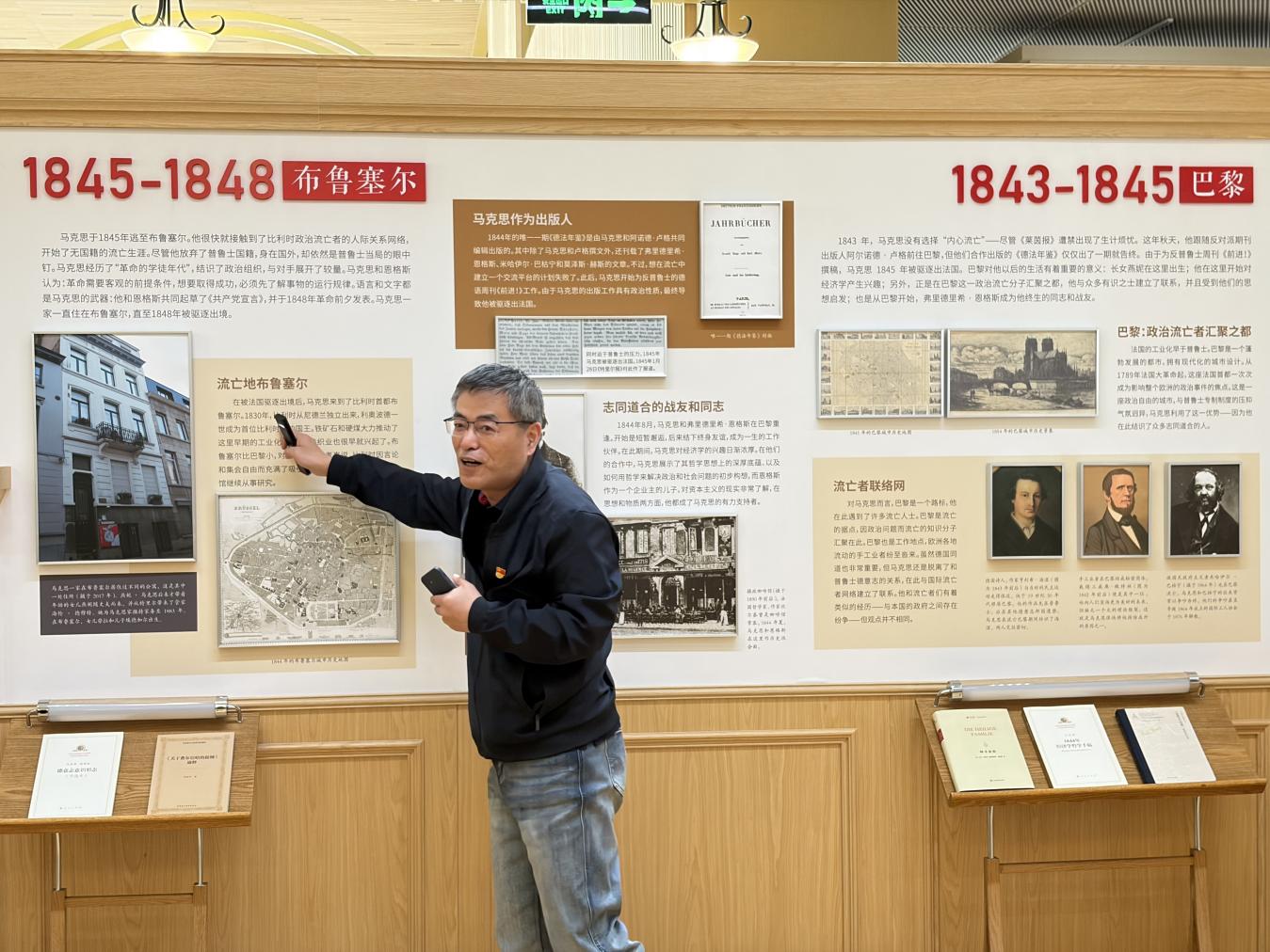 研学过程中,陈向义教授以马克思革命生涯展区为课堂,开展了一场别开生面的现场教学活动。他跳出传统理论讲授模式,以展区史料为依托,结合马克思不同阶段的革命实践与思想动态,补充讲解了大量历史细节,重点强调要从“活生生的人”的维度理解马克思——马克思不仅是科学理论的创立者,更是在时代浪潮中直面挑战、坚守理想、持续探索的革命者。陈教授的讲解将展区的静态史料转化为动态的思想叙事,引导支部成员跳出教科书式的刻板印象,深入理解马克思主义形成发展的历史逻辑与实践逻辑。这种展陈和研讨相融合的现场化教学形式,打破了理论学习与历史现场的壁垒,让抽象的理论在具体的历史情境中变得可感可触,实现了理论教学与现场研学的深度融合。